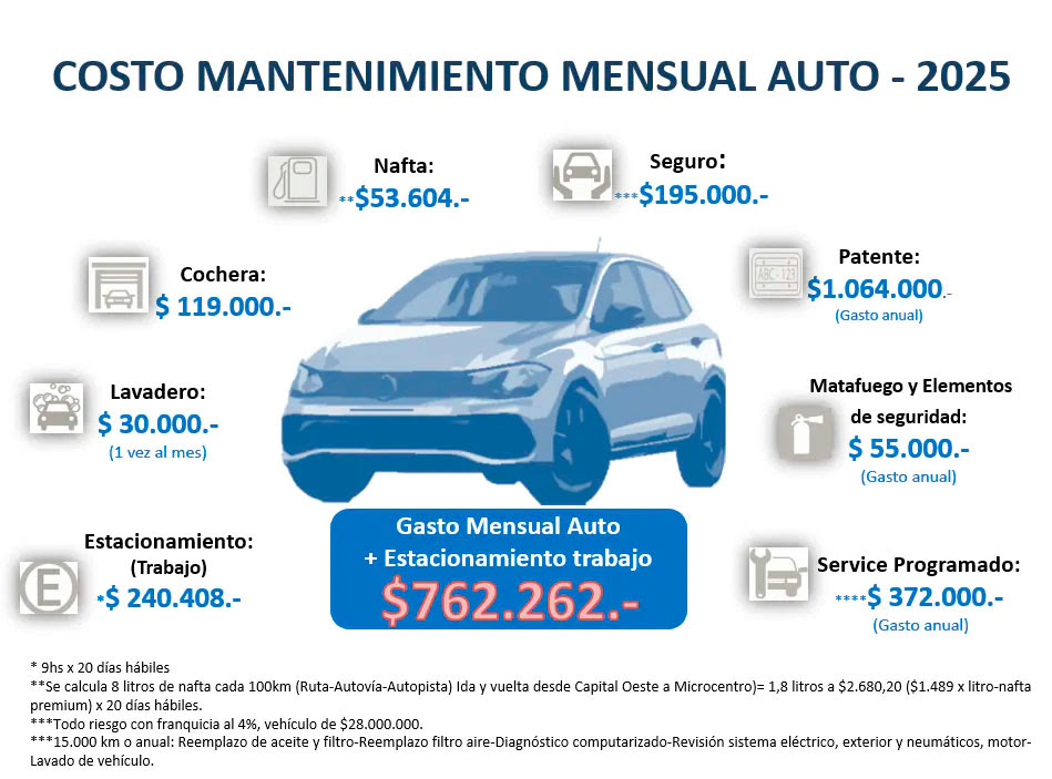 Para darle forma al análisis, se tomó un caso concreto: una persona que recorre unos 22 kilómetros en total para ir y volver del trabajo, durante 20 días hábiles por mes. La primera pregunta es: ¿cuánto cuesta hacer ese trayecto en cada modalidad?. Con un auto modelo 2025, se estimó que el costo de mantenimiento mensual asciende a $762.262. En ese número se incluyen cochera, estacionamiento durante la jornada laboral, seguro, patente, nafta, lavadero, service programado y elementos de seguridad. Los gastos anuales se prorratearon en doce meses para tener una base homogénea de comparación.