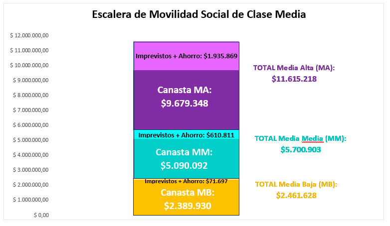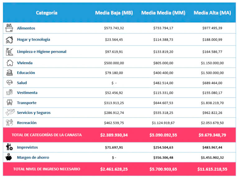 Para lograr una estimación realista, la consultora incorporó un margen de imprevistos proporcional a la capacidad económica de cada segmento: 3% del valor total de la canasta en MB y 5% en MM y MA. También contemplamos un margen de ahorro diferenciado: inexistente en MB, de 5% a 10% en MM y de 15% a 20% en MA.