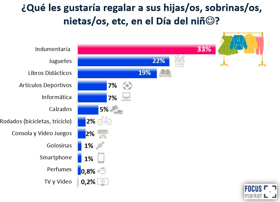 Según un relevamiento de Focus Market realizado a 2.873 personas en todo el país, la indumentaria desplazó a los juguetes como el regalo más elegido para el Día del Niño, marcando un cambio en las preferencias de los consumidores. El informe también analiza los canales de compra, promociones y el impacto económico de esta fecha en el comercio minorista.