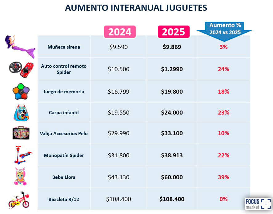 A pesar de que los juguetes cedieron terreno, siguen siendo clave. El estudio detectó aumentos de precios respecto a 2024 en 8 productos destacados de jugueterías.
