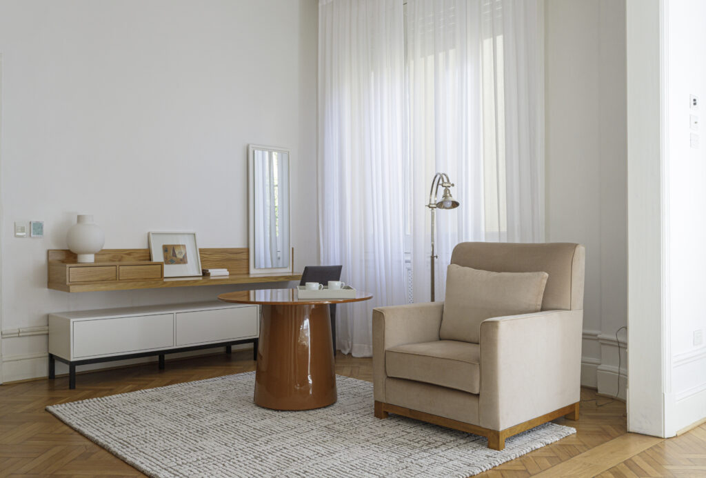 Además, se respetaron y conservaron materiales originales a lo largo de todo el departamento, aportando autenticidad y valor patrimonial al proyecto. Se destacan el piso de madera en las áreas sociales, los cerámicos originales en los baños y los artefactos de iluminación del hall de distribución, que fueron cuidadosamente restaurados para mantener la esencia del estilo original.