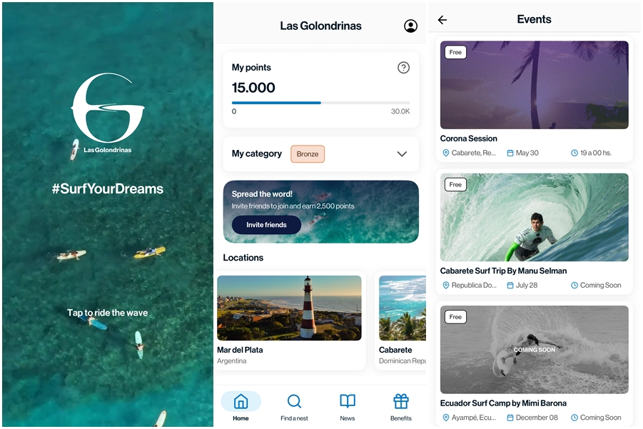 Se trata de un modelo de negocio pionero para la comunidad surfer. Gerónimo Usuna, socio fundador y CEO de Las Golondrinas, explica: “A diferencia de otras apps que solo conectan surfistas o brindan pronósticos, esta es la primera que integra un sistema de fidelización tipo loyalty club, con puntos canjeables por noches de alojamiento y beneficios para el viajero a nivel regional y global“.