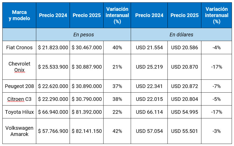 Durante 2025 ya se observó una dinámica particular en los precios de los vehículos medida en dólares. Incluso con aumentos significativos en pesos, varios de los modelos más vendidos del mercado registraron una baja interanual en moneda estadounidense, producto de que la cotización del dólar oficial avanzó a un ritmo superior al de los ajustes de listas de precios.
