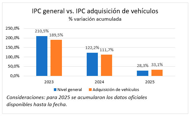 En materia de precios, el rubro “Adquisición de vehículos” mostró una variación acumulada superior al IPC general: 33,1% frente a una inflación estimada en torno al 29% anual, reflejando que los autos continuaron encareciéndose por encima del promedio de la economía.