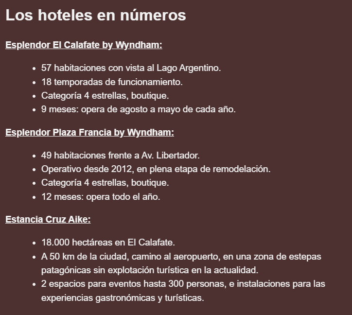 En 2006 inaugura su primer hotel: Esplendor El Calafate, y en 2012 adquirieron el histórico Hotel Plaza Francia en Buenos Aires, que tras una remodelación integral reabre como Esplendor Plaza Francia by Wyndham. En 2023, adquirió la Estancia Cruz Aike, un predio de 18 mil hectáreas en El Calafate destinado a turismo de experiencias y producción ovina.
